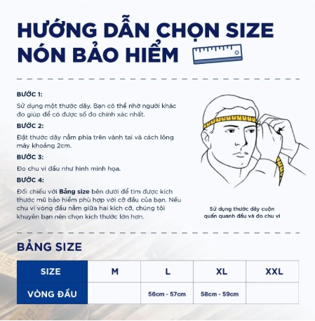 Để chọn đúng size mũ bảo hiểm, bạn nên đo vòng đầu bằng thước dây, sau đó so sánh kết quả với bảng size của hãng sản xuất. Nếu số đo nằm giữa hai size, nên chọn size lớn hơn để đảm bảo sự thoải mái và an toàn.